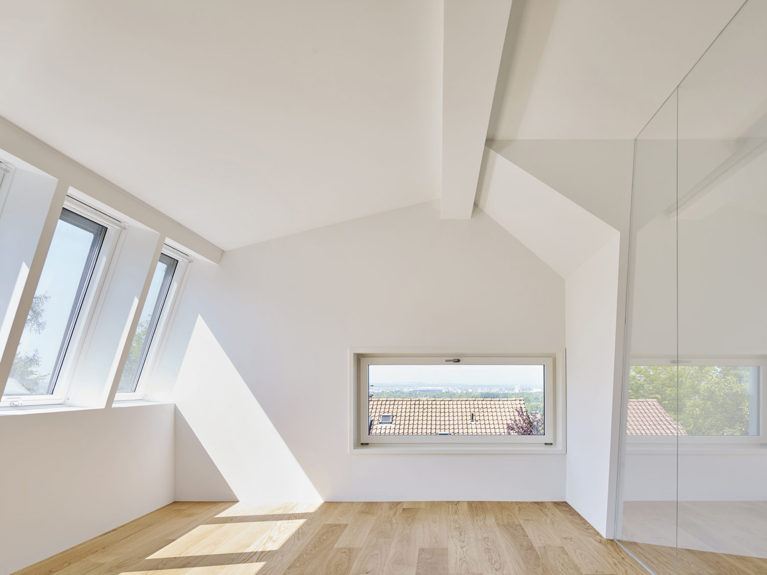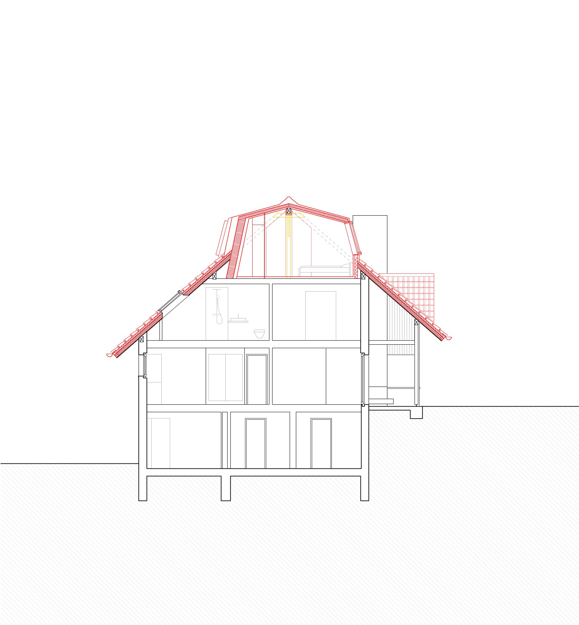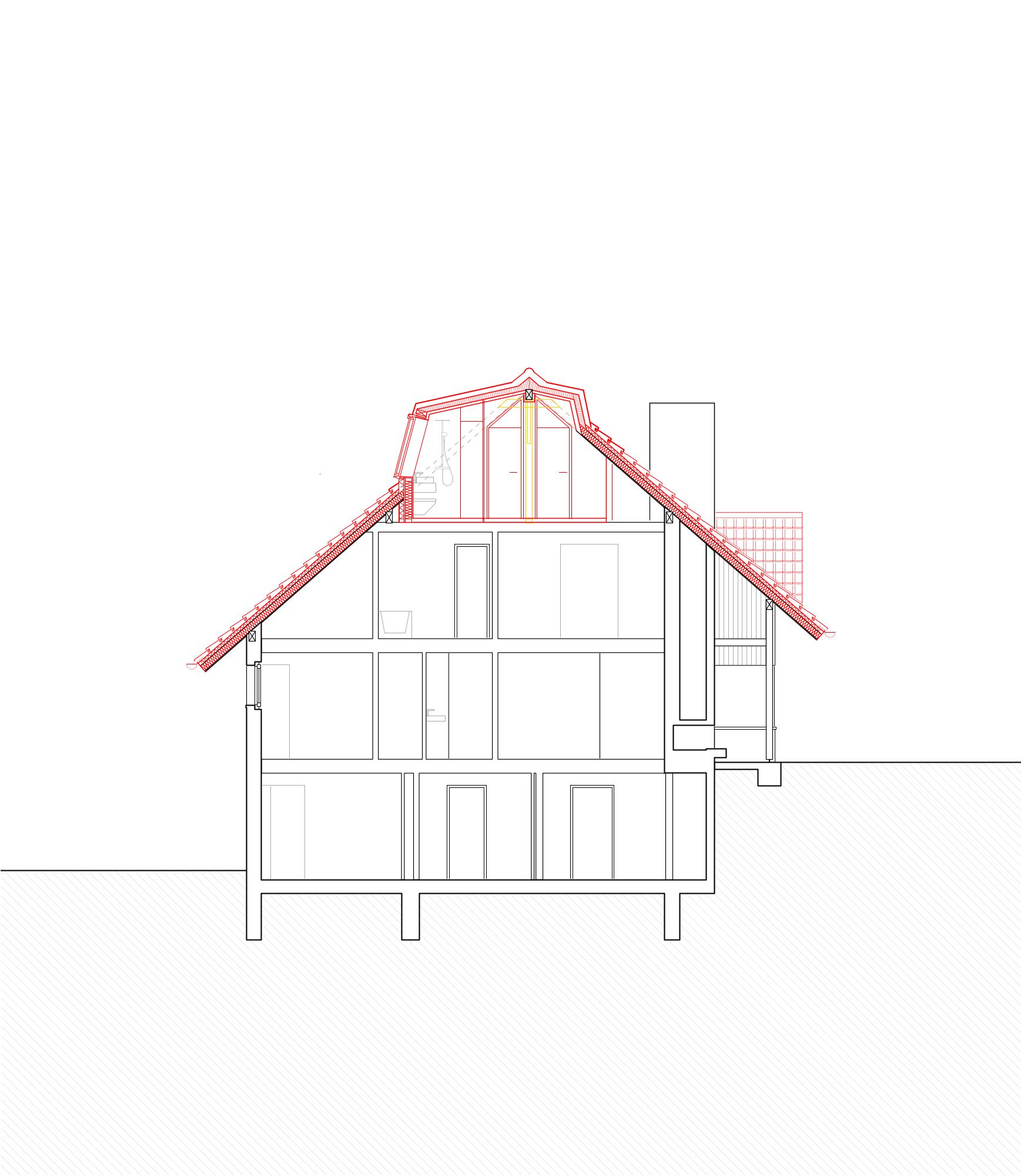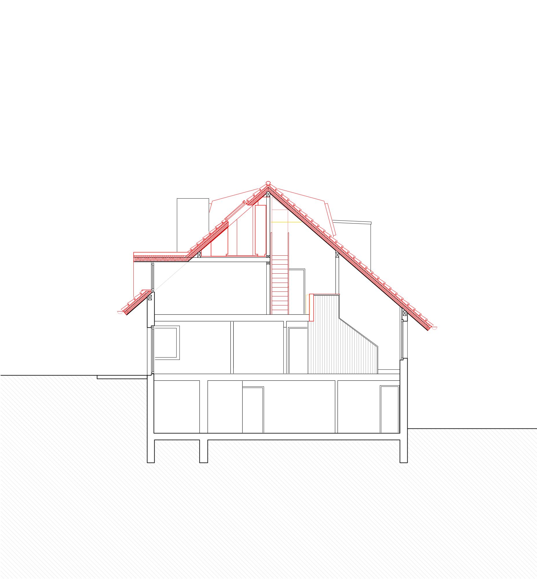Im Zuge der Dachstuhlerneuerung, sollte der Estrich resp. Dachboden zur Wohnnutzung erweitert werden. Der vorhandene Aufzugsschacht auf der Nordfassade, sowie der grosse Kamin im Süden schränkten die Raumerweiterung im Dachgeschoss erheblich ein. Die gesetzlich maximal erlaubte Frontansichtsfläche der Lukarnen wurde maximal ausgenutzt. Zwei diagonal positionierte wegklappende Lukarnen ermöglichten eine sinnvolle Wohnraumerweiterung mit einer maximal nutzbaren Raumfläche. Eine neue schmale Zugangstreppe definiert über die Vorhalle im ersten Obergeschoss die dazu passende Erschliessung. Das Schlafzimmer im Süden liegt dem transparenten Badezimmer im Norden diagonal gegenüber. Die schräg aufklappenden Lukarnen betonen diese schräge Position und verbinden die Räume miteinander. Die Garderobe befindet sich als begehbarer Kleiderschrank im langgezogenen Nebenraum. Die mittig positionierte Firstbalkenstütze wurde entfernt, der Firstbalken verstärkt und die Giebelfassade mit einem Panoramafenster Richtung Basel und Elsass geöffnet. Zur optimalen Belüftung und Verschattung wurden in die Lukarnen nach aussen öffneten Dachflächenfenstern montiert.