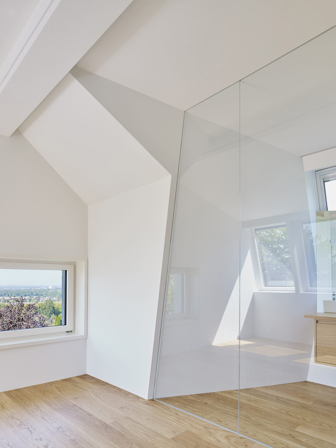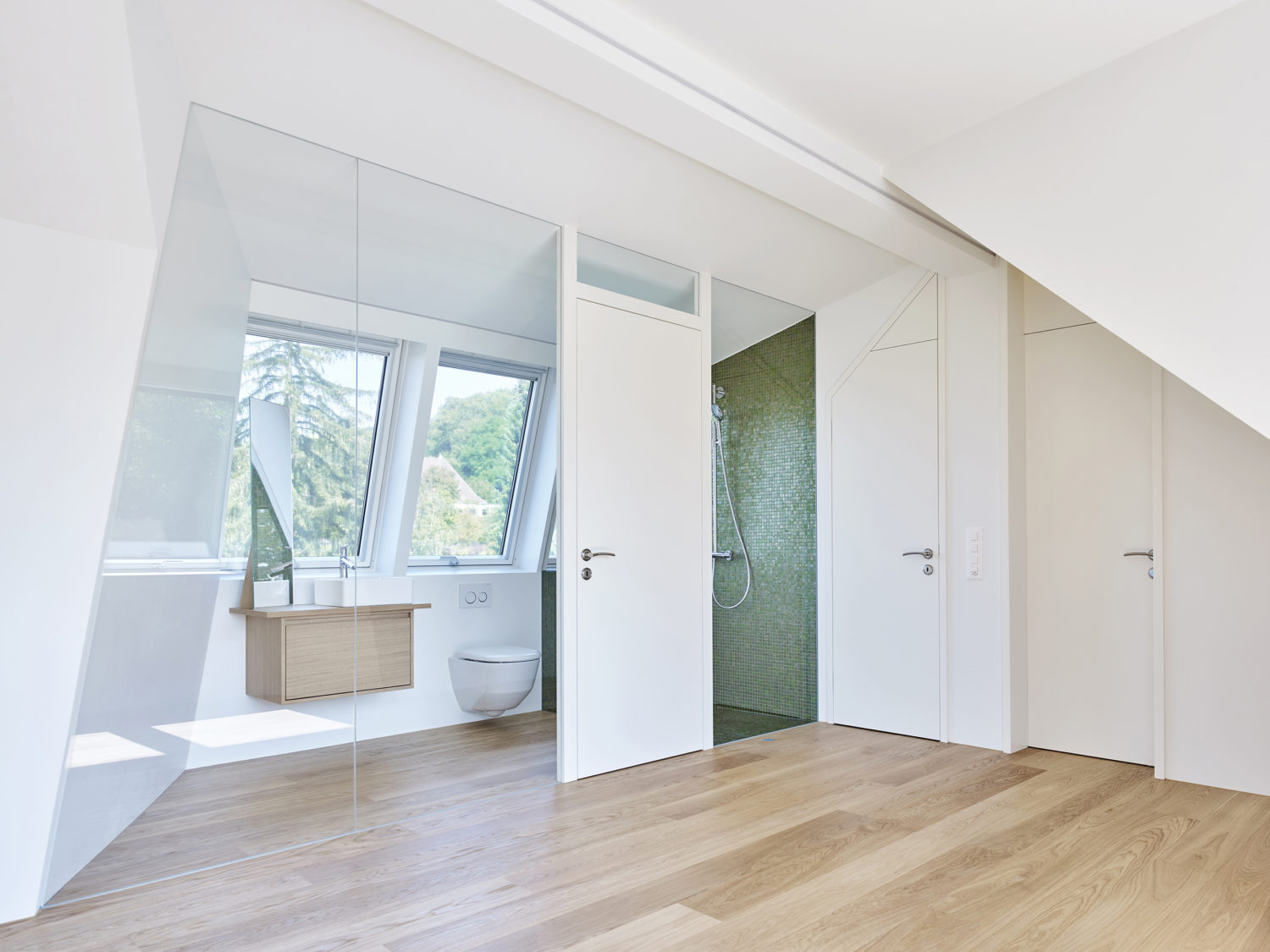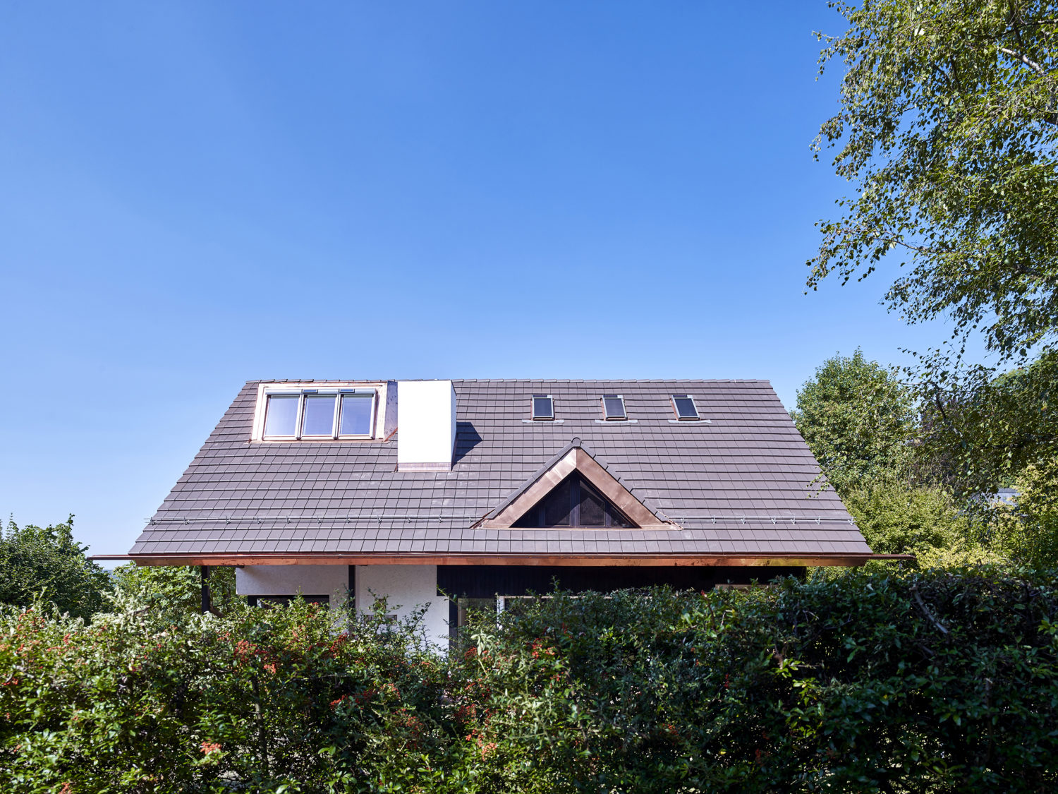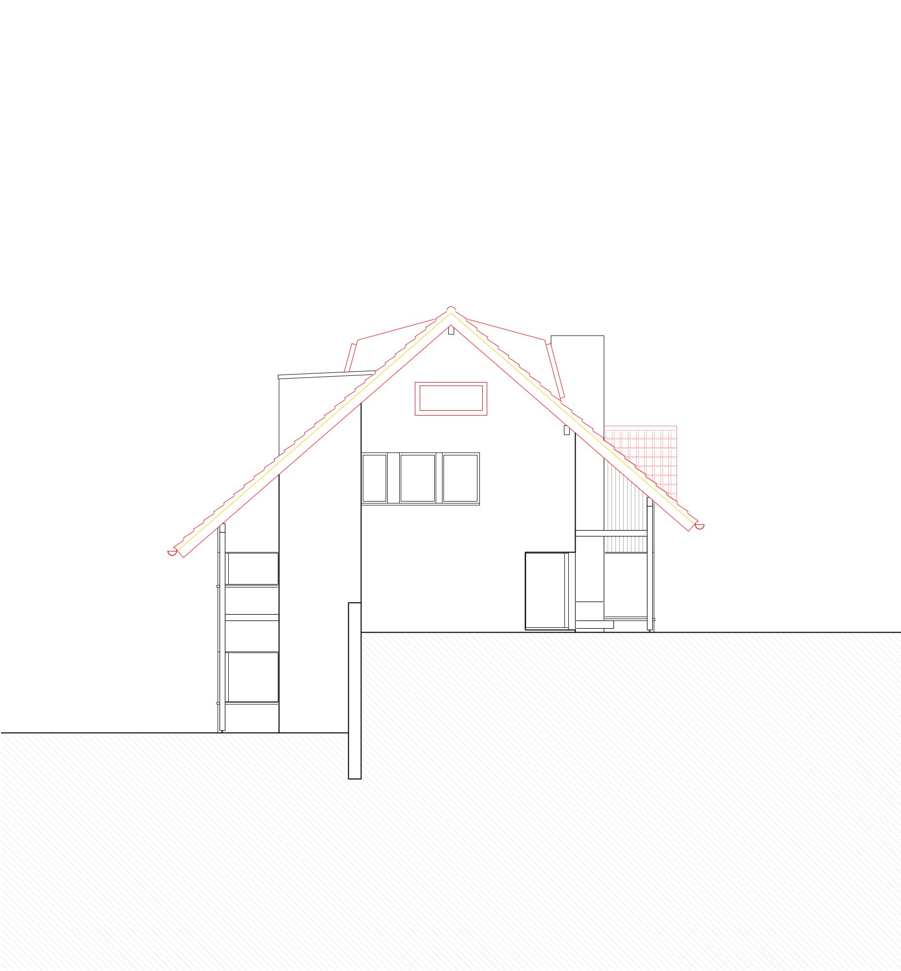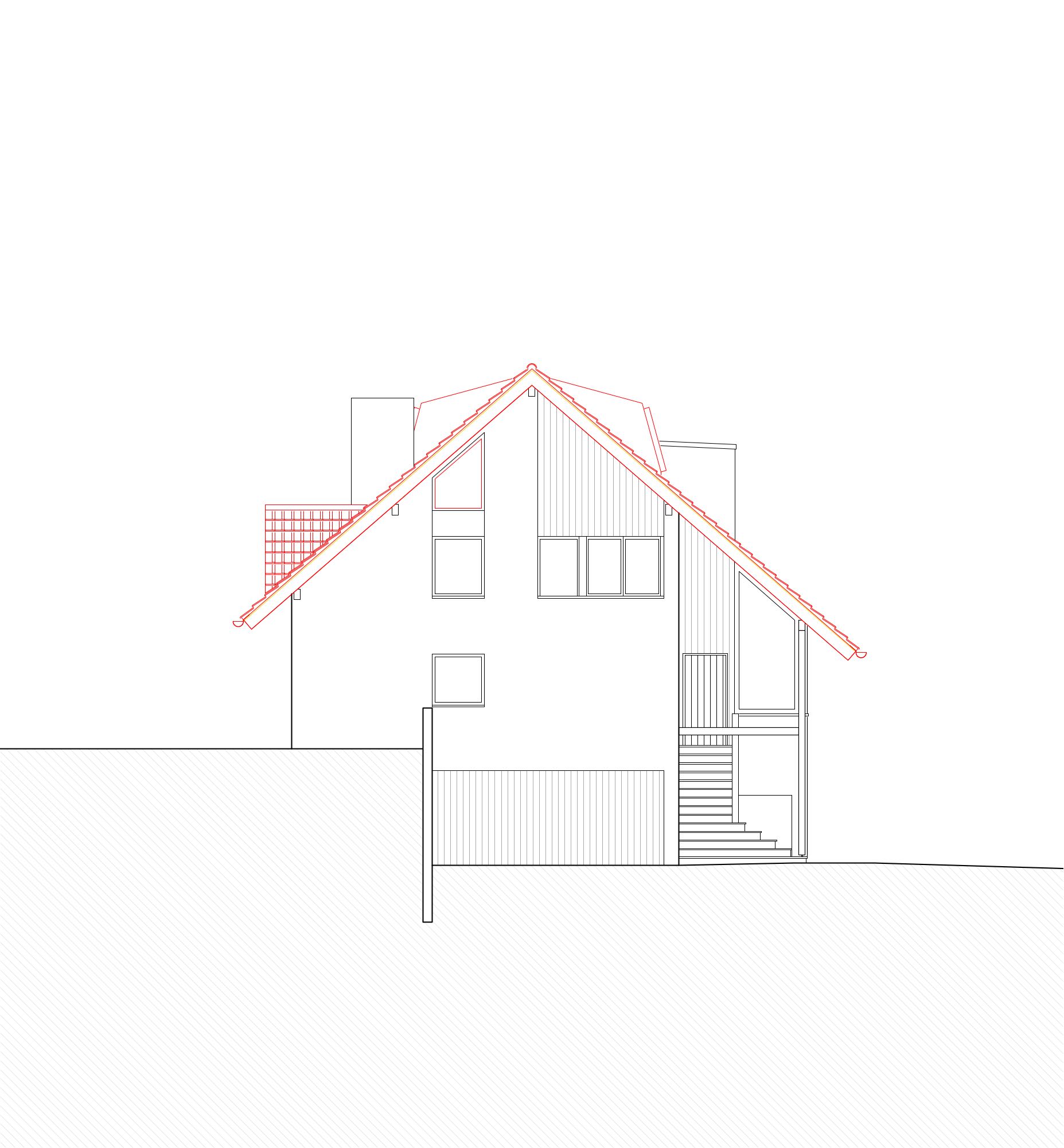 Im Zuge der Dachstuhlerneuerung, sollte der Estrich resp. Dachboden zur Wohnnutzung erweitert werden. Der vorhandene Aufzugsschacht auf der Nordfassade, sowie der grosse Kamin im Süden schränkten die Raumerweiterung im Dachgeschoss erheblich ein. Die gesetzlich maximal erlaubte Frontansichtsfläche der Lukarnen wurde maximal ausgenutzt. Zwei diagonal positionierte wegklappende Lukarnen ermöglichten eine sinnvolle Wohnraumerweiterung mit einer maximal nutzbaren Raumfläche. Eine neue schmale Zugangstreppe definiert über die Vorhalle im ersten Obergeschoss die dazu passende Erschliessung. Das Schlafzimmer im Süden liegt dem transparenten Badezimmer im Norden diagonal gegenüber. Die schräg aufklappenden Lukarnen betonen diese schräge Position und verbinden die Räume miteinander. Die Garderobe befindet sich als begehbarer Kleiderschrank im langgezogenen Nebenraum. Die mittig positionierte Firstbalkenstütze wurde entfernt, der Firstbalken verstärkt und die Giebelfassade mit einem Panoramafenster Richtung Basel und Elsass geöffnet. Zur optimalen Belüftung und Verschattung wurden in die Lukarnen nach aussen öffneten Dachflächenfenstern montiert.