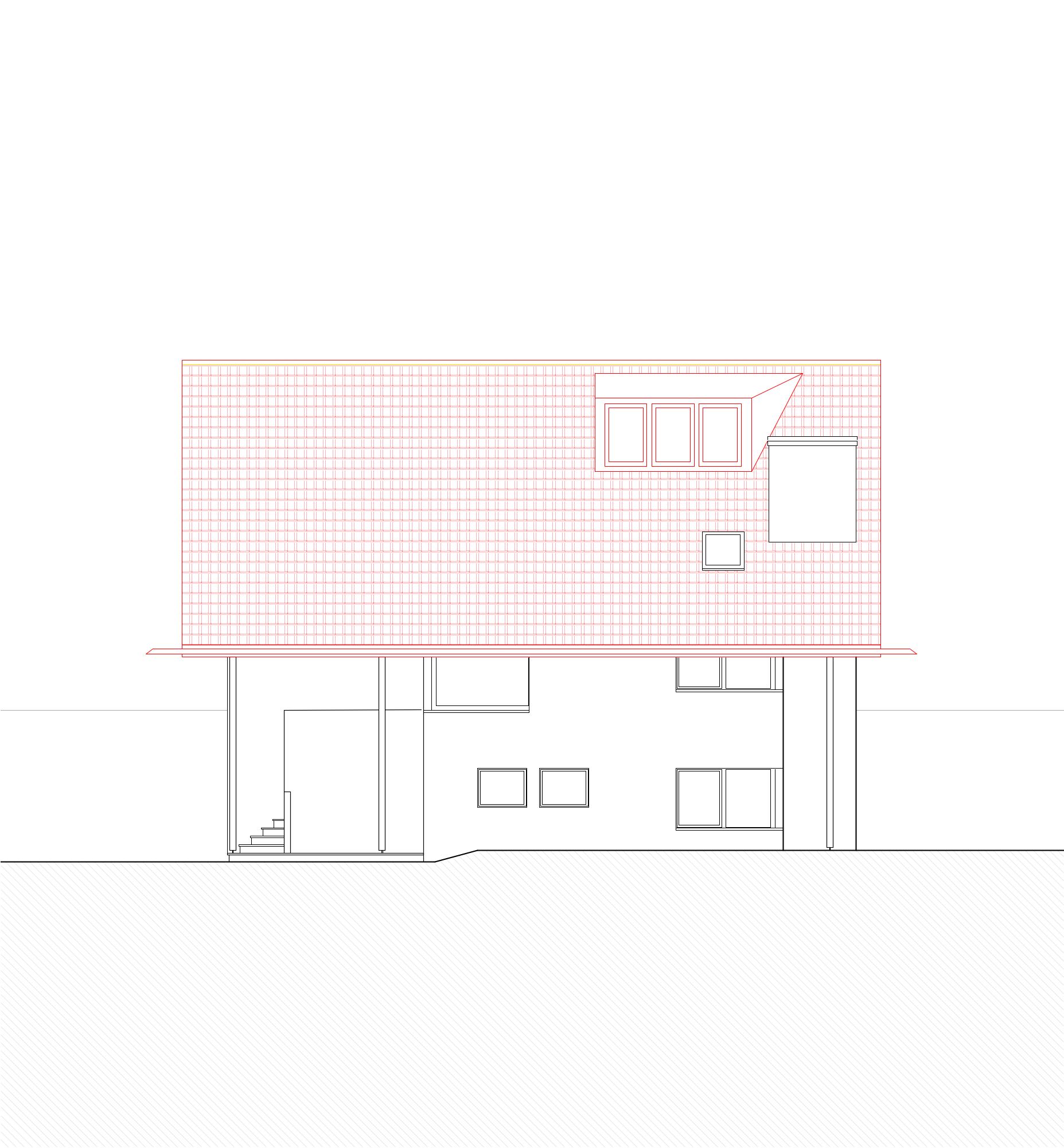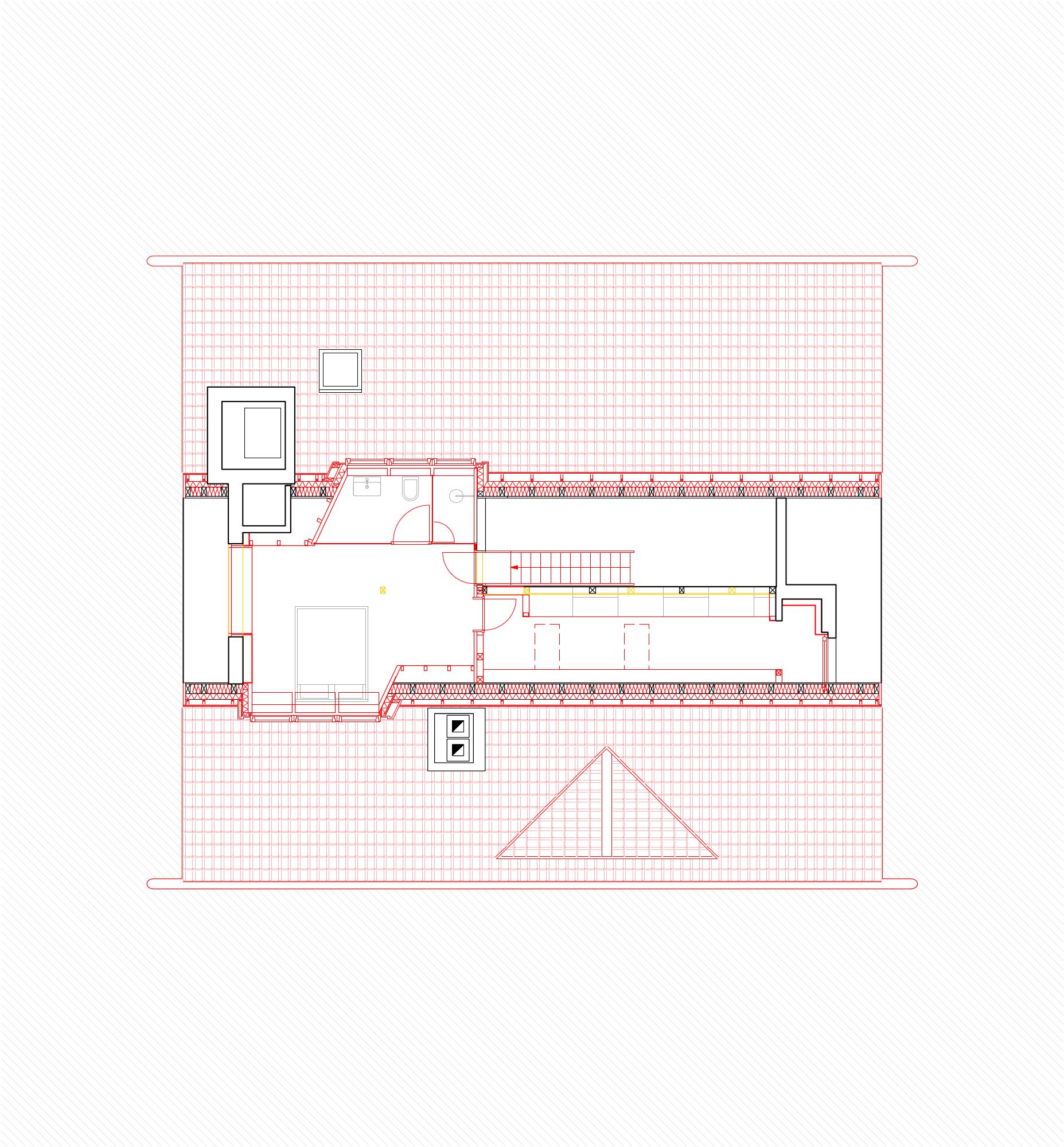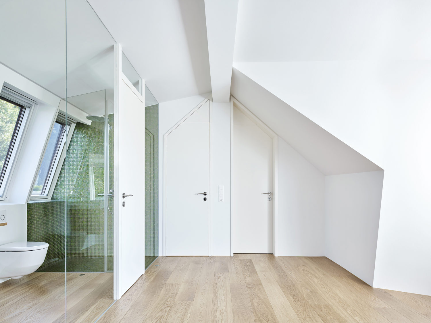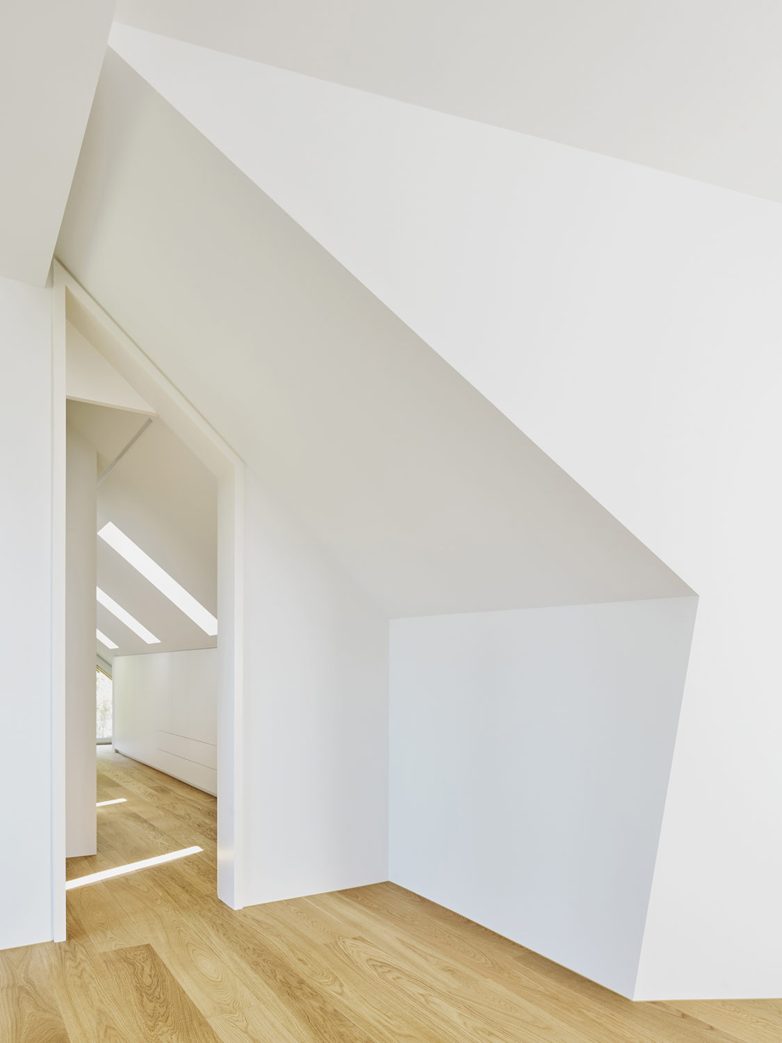 Im Zuge der Dachstuhlerneuerung, sollte der Estrich resp. Dachboden zur Wohnnutzung erweitert werden. Der vorhandene Aufzugsschacht auf der Nordfassade, sowie der grosse Kamin im Süden schränkten die Raumerweiterung im Dachgeschoss erheblich ein. Die gesetzlich maximal erlaubte Frontansichtsfläche der Lukarnen wurde maximal ausgenutzt. Zwei diagonal positionierte wegklappende Lukarnen ermöglichten eine sinnvolle Wohnraumerweiterung mit einer maximal nutzbaren Raumfläche. Eine neue schmale Zugangstreppe definiert über die Vorhalle im ersten Obergeschoss die dazu passende Erschliessung. Das Schlafzimmer im Süden liegt dem transparenten Badezimmer im Norden diagonal gegenüber. Die schräg aufklappenden Lukarnen betonen diese schräge Position und verbinden die Räume miteinander. Die Garderobe befindet sich als begehbarer Kleiderschrank im langgezogenen Nebenraum. Die mittig positionierte Firstbalkenstütze wurde entfernt, der Firstbalken verstärkt und die Giebelfassade mit einem Panoramafenster Richtung Basel und Elsass geöffnet. Zur optimalen Belüftung und Verschattung wurden in die Lukarnen nach aussen öffneten Dachflächenfenstern montiert.