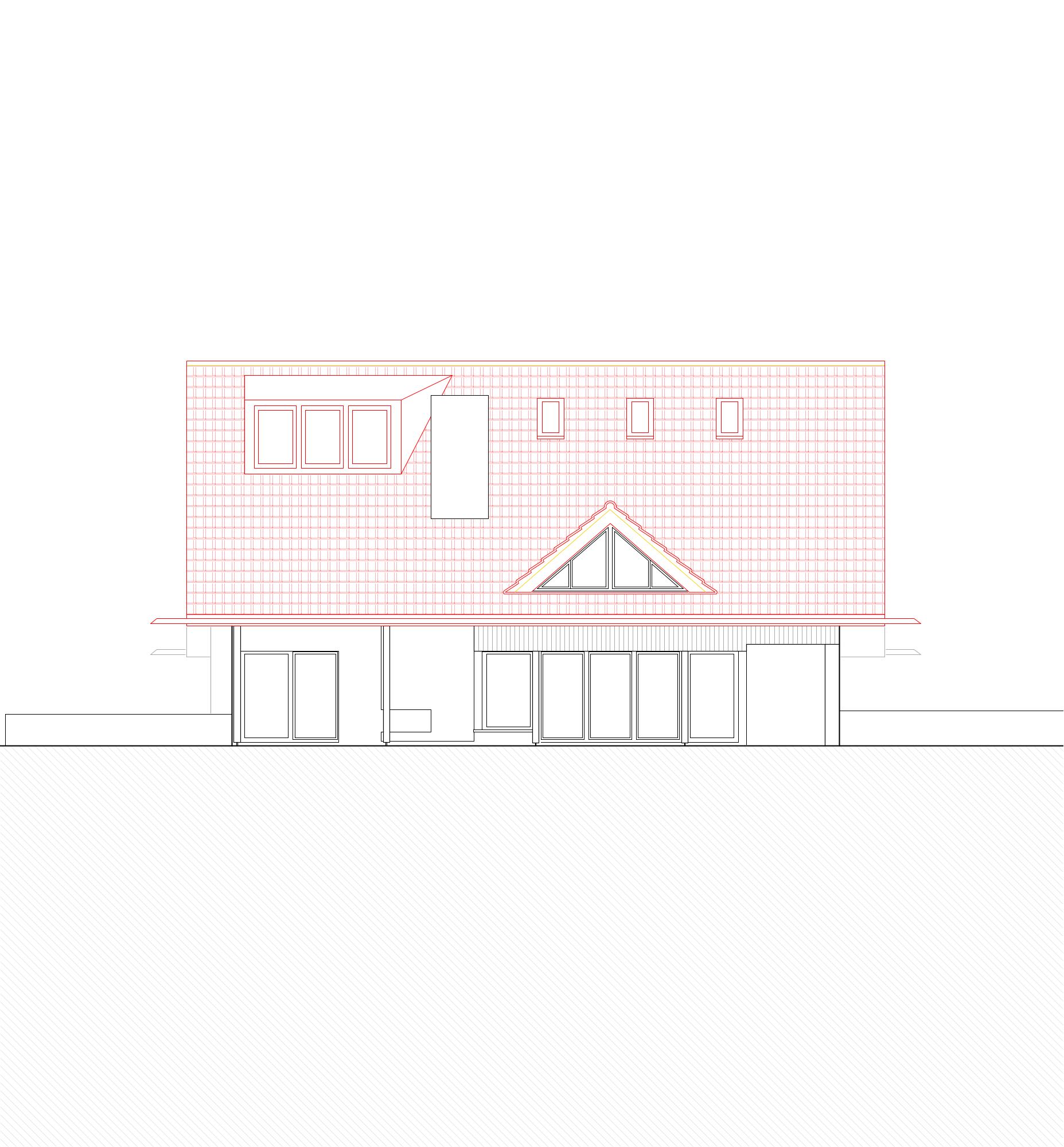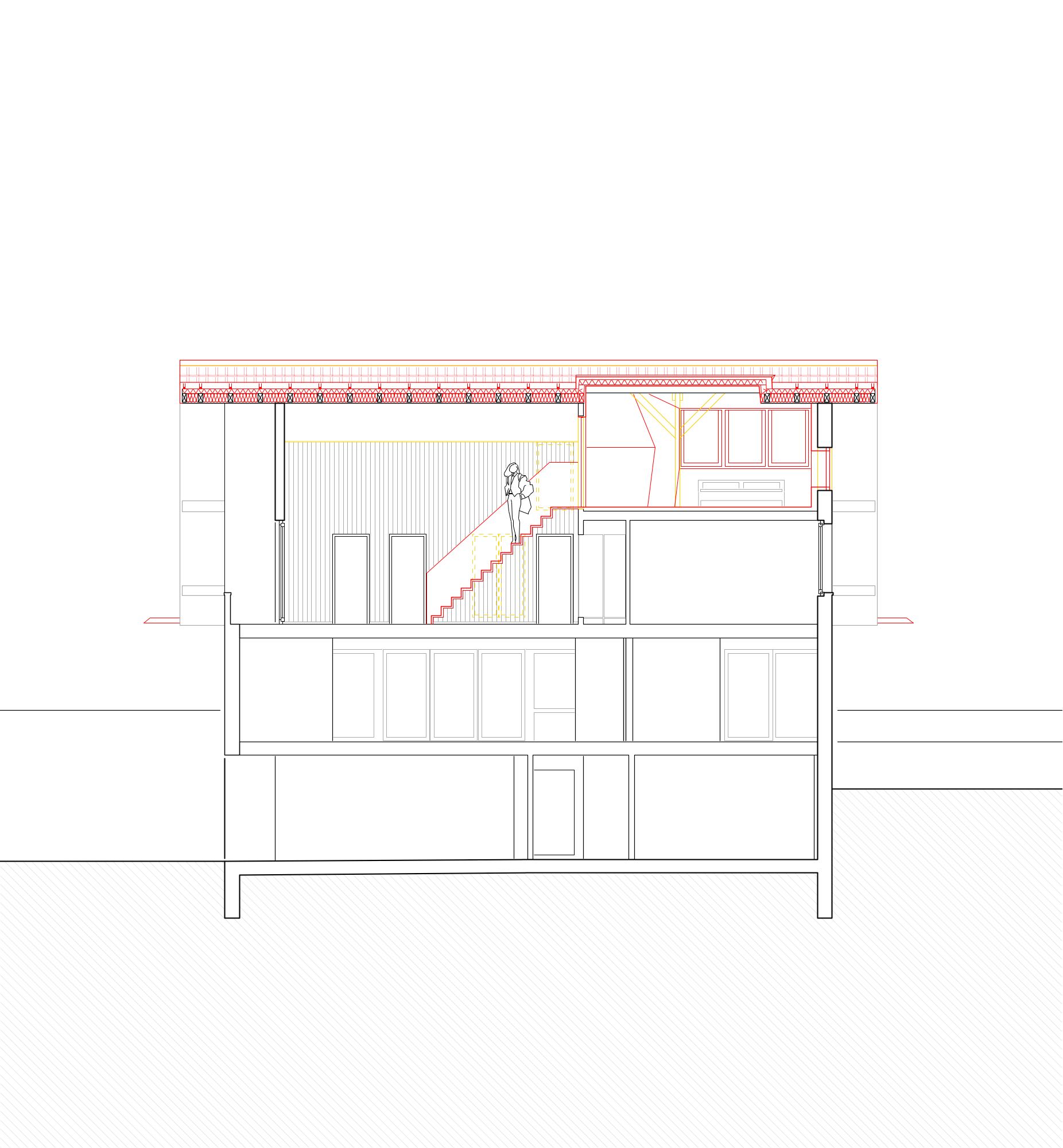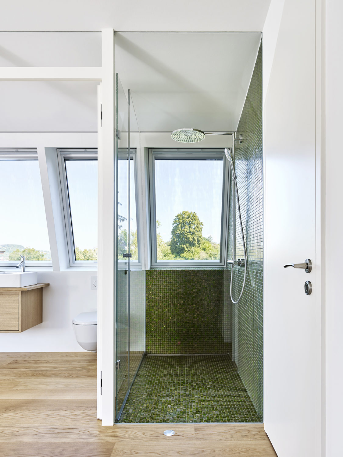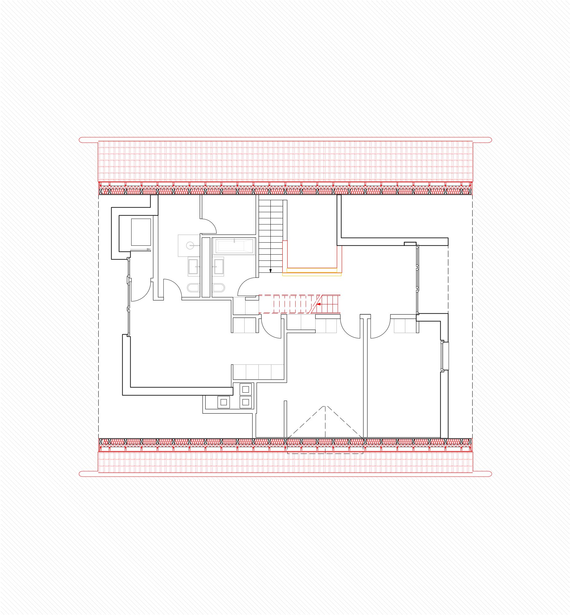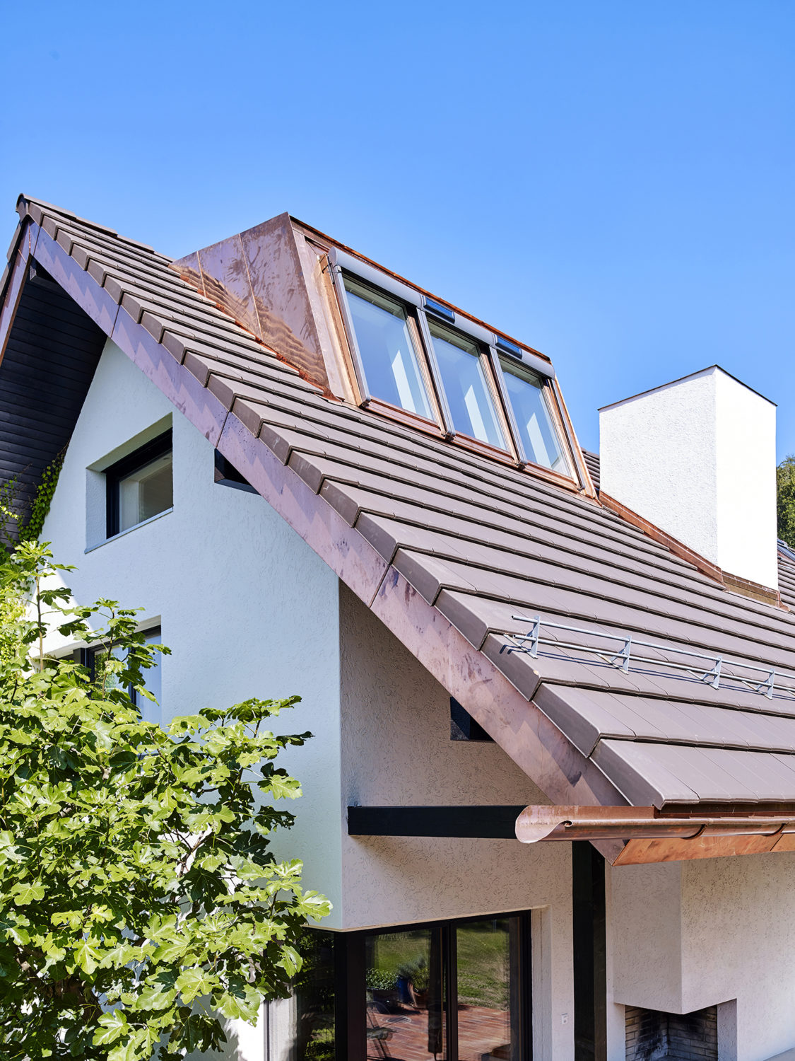 Im Zuge der Dachstuhlerneuerung, sollte der Estrich resp. Dachboden zur Wohnnutzung erweitert werden. Der vorhandene Aufzugsschacht auf der Nordfassade, sowie der grosse Kamin im Süden schränkten die Raumerweiterung im Dachgeschoss erheblich ein. Die gesetzlich maximal erlaubte Frontansichtsfläche der Lukarnen wurde maximal ausgenutzt. Zwei diagonal positionierte wegklappende Lukarnen ermöglichten eine sinnvolle Wohnraumerweiterung mit einer maximal nutzbaren Raumfläche. Eine neue schmale Zugangstreppe definiert über die Vorhalle im ersten Obergeschoss die dazu passende Erschliessung. Das Schlafzimmer im Süden liegt dem transparenten Badezimmer im Norden diagonal gegenüber. Die schräg aufklappenden Lukarnen betonen diese schräge Position und verbinden die Räume miteinander. Die Garderobe befindet sich als begehbarer Kleiderschrank im langgezogenen Nebenraum. Die mittig positionierte Firstbalkenstütze wurde entfernt, der Firstbalken verstärkt und die Giebelfassade mit einem Panoramafenster Richtung Basel und Elsass geöffnet. Zur optimalen Belüftung und Verschattung wurden in die Lukarnen nach aussen öffneten Dachflächenfenstern montiert.