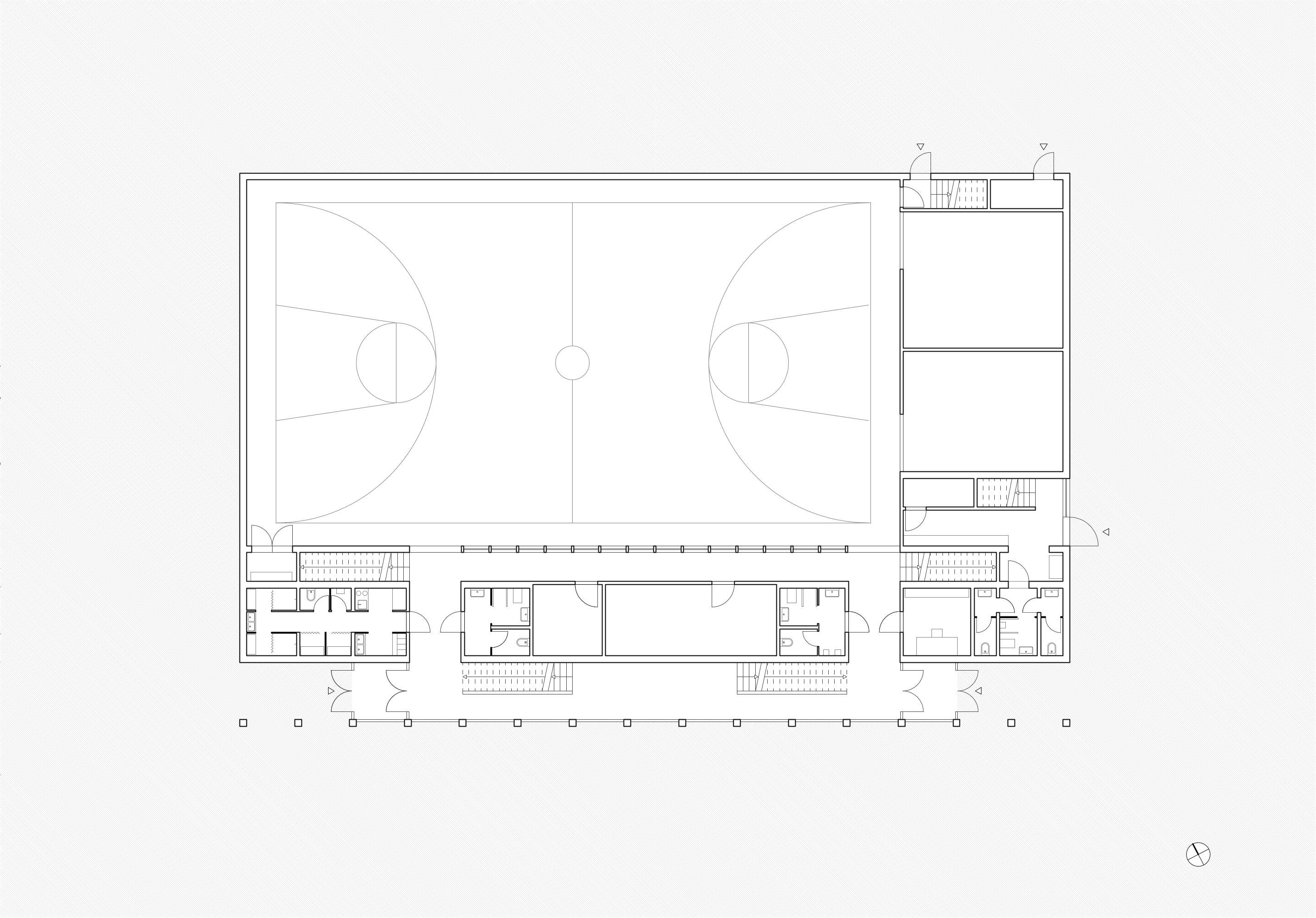 In der dritten Zone gelangt man von den Umkleidebereichen im Obergeschoss ins Erdgeschoss nach unten und direkt in die Sporthalle. Dieser dreischichte Aufbau ist im EG, wie auch im OG spürbar. Blickbeziehungen von Ost nach West machen die Halle in ihrer gesamten Länge erlebbar.