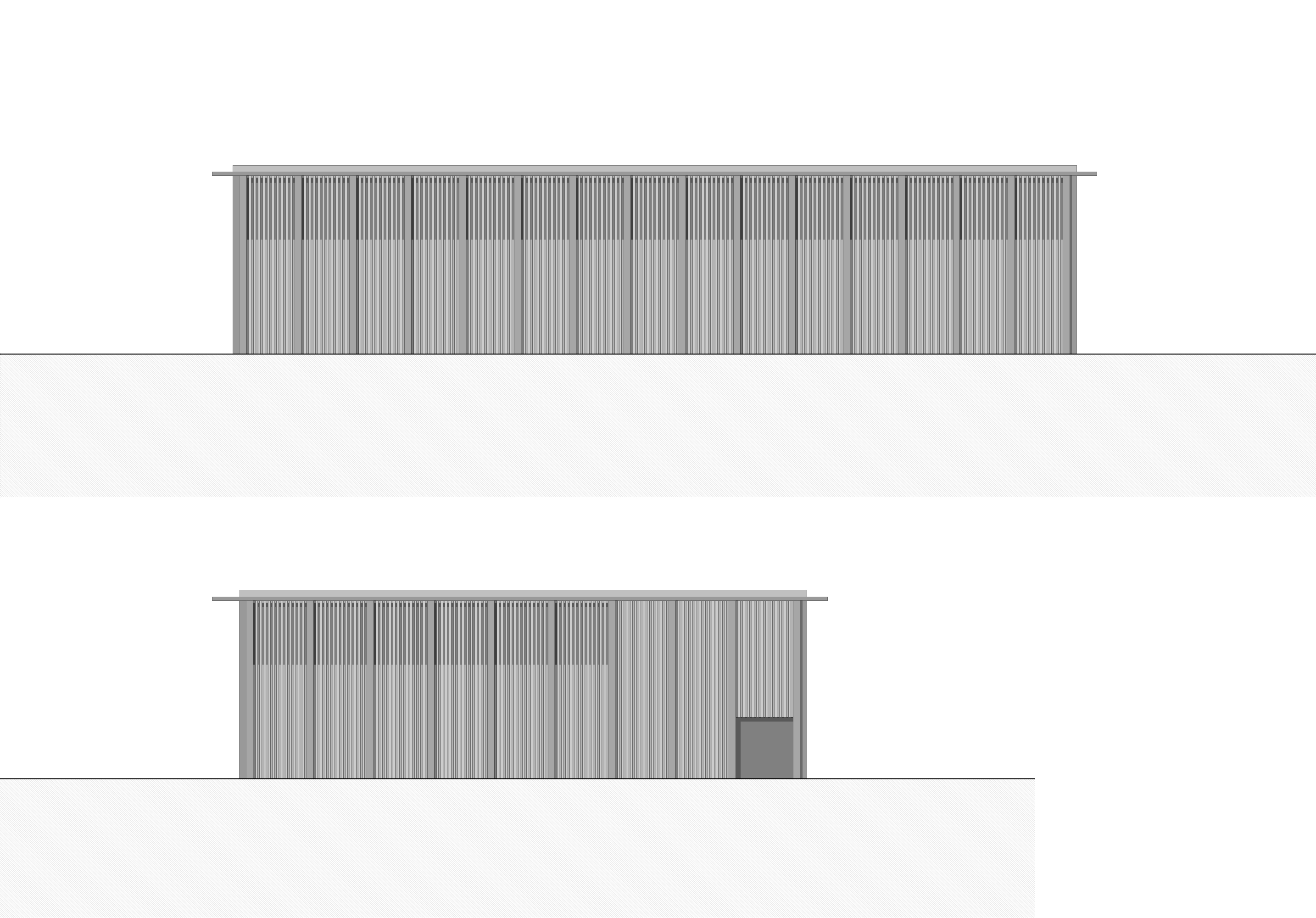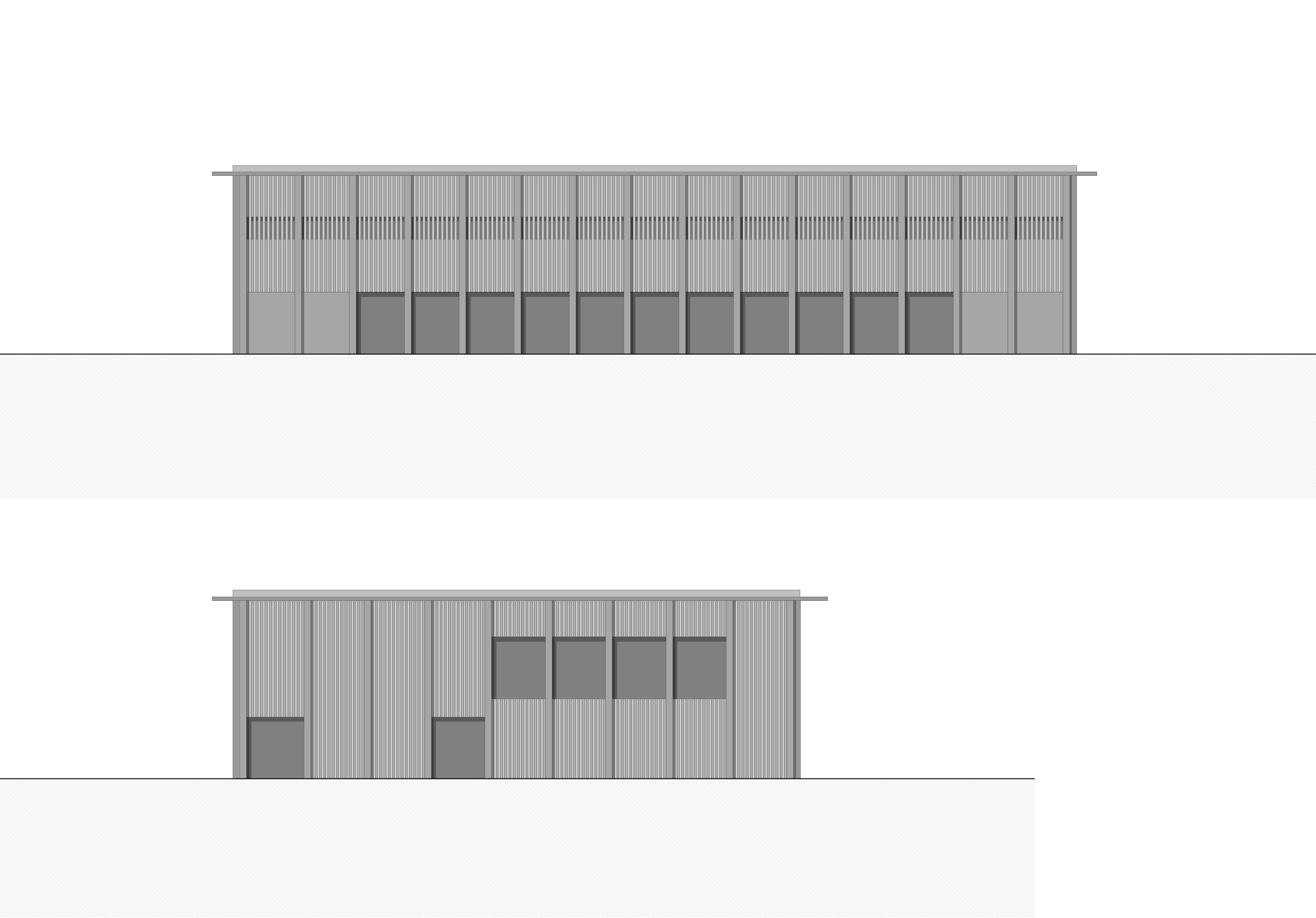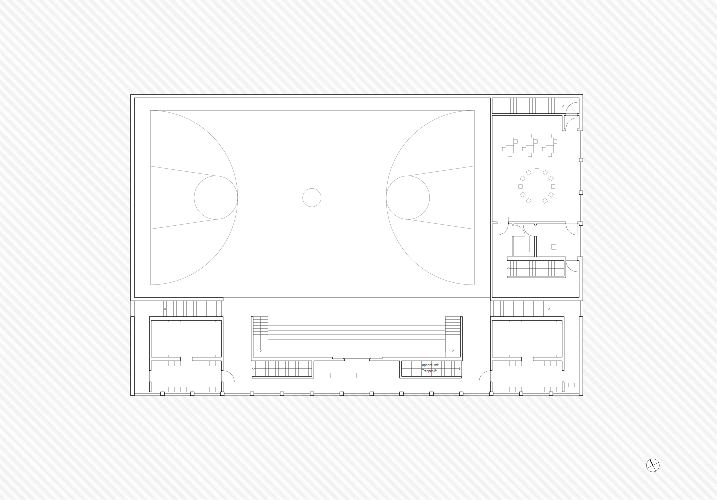 Im Obergeschoss sind die Umkleidebereiche und Duschen jeweils an den Endpunkten der Halle positioniert und spannen dazwischen den öffentlichen Bereich auf. Im Zentrum befindet sich die mobile Zuschauertribüne, die bei Bedarf aufgebaut werden kann. Je nach Veranstaltung bietet die innere Zone genügend Raum für Zuschauer und Publikum. Das Volumen über den Geräteräumen kann in dieser Variante als Kindergarten ausgebaut werden, wird über grosszügige Verglasung von Osten belichtet und kann über einen separate Eingang im Erdgeschoss erreicht werden. Eine Verbindungstüre zwischen Sporthalle und Kindergarten ermöglicht einen zusätzlichen Fluchtweg.