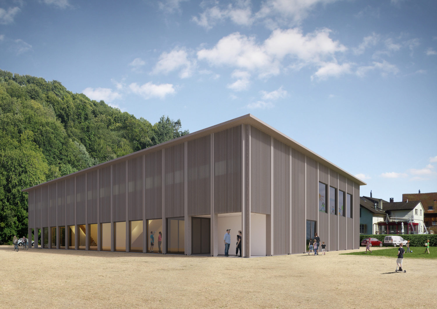 Die Sporthalle ist als Systemhalle mit einer Systembreite von 2.40m konzipiert. Jedes der 15 Elementen schliesst mit einer halben Stütze über eine Lisene verbunden am nächsten Element an und ist je nach Bereich mit geschlossenen, halbgeschlossenene oder verglasten Elementen ausgefacht. Im Aussenbereich ist das Holz vorvergraut, im Innenbereich weiss lasiert. Die vertikale Holzlamellenfassade strickt sich wie eine Gardine um das Gebäude herum. Dabei verlaufen die Lamellen teilweise über die Fensterbänder hinweg und bewahren ein homogenes Erscheinungsbild. Blicke von Innen nach Aussen sind möglich. Einblicke werden verwehrt.