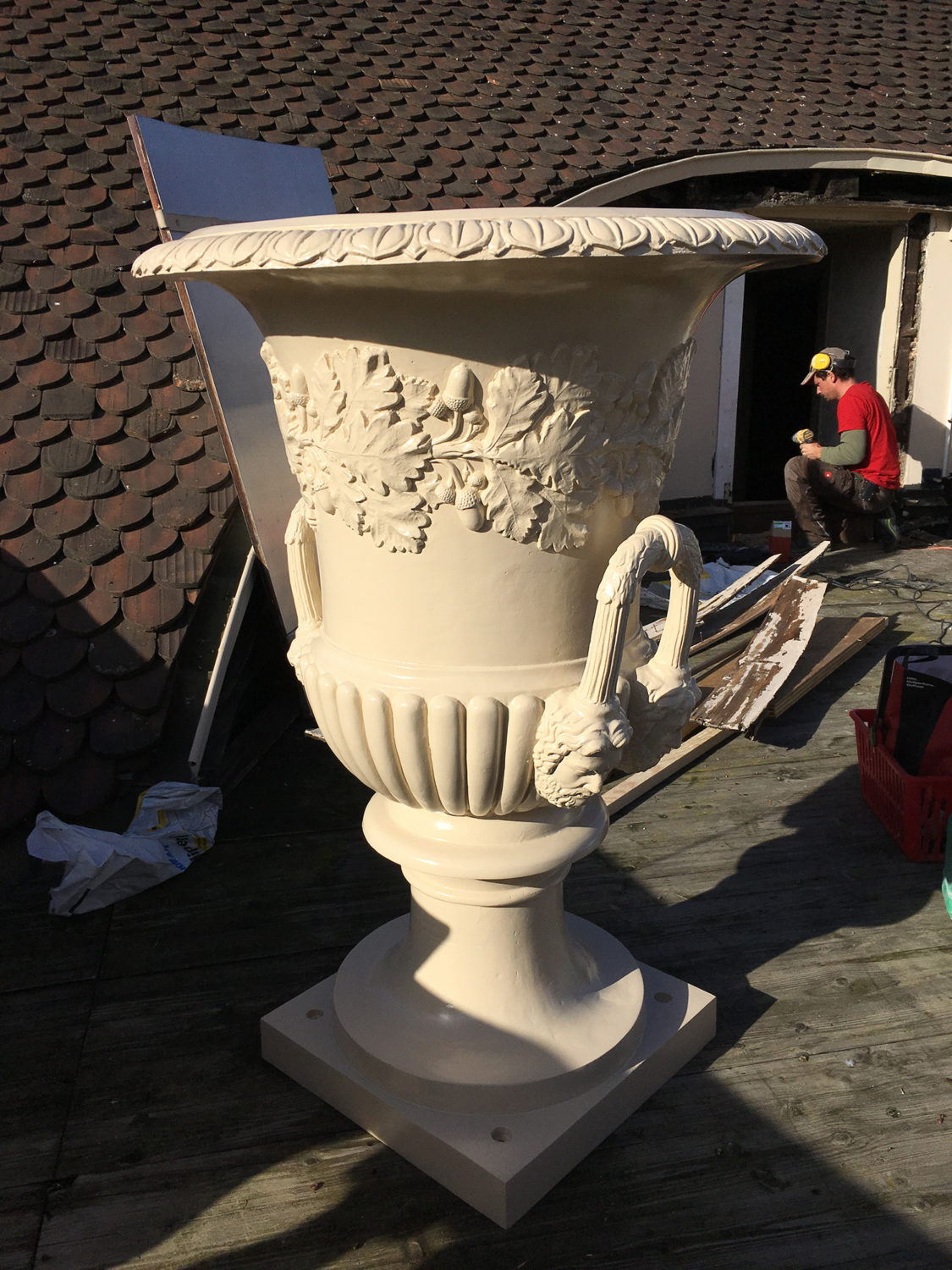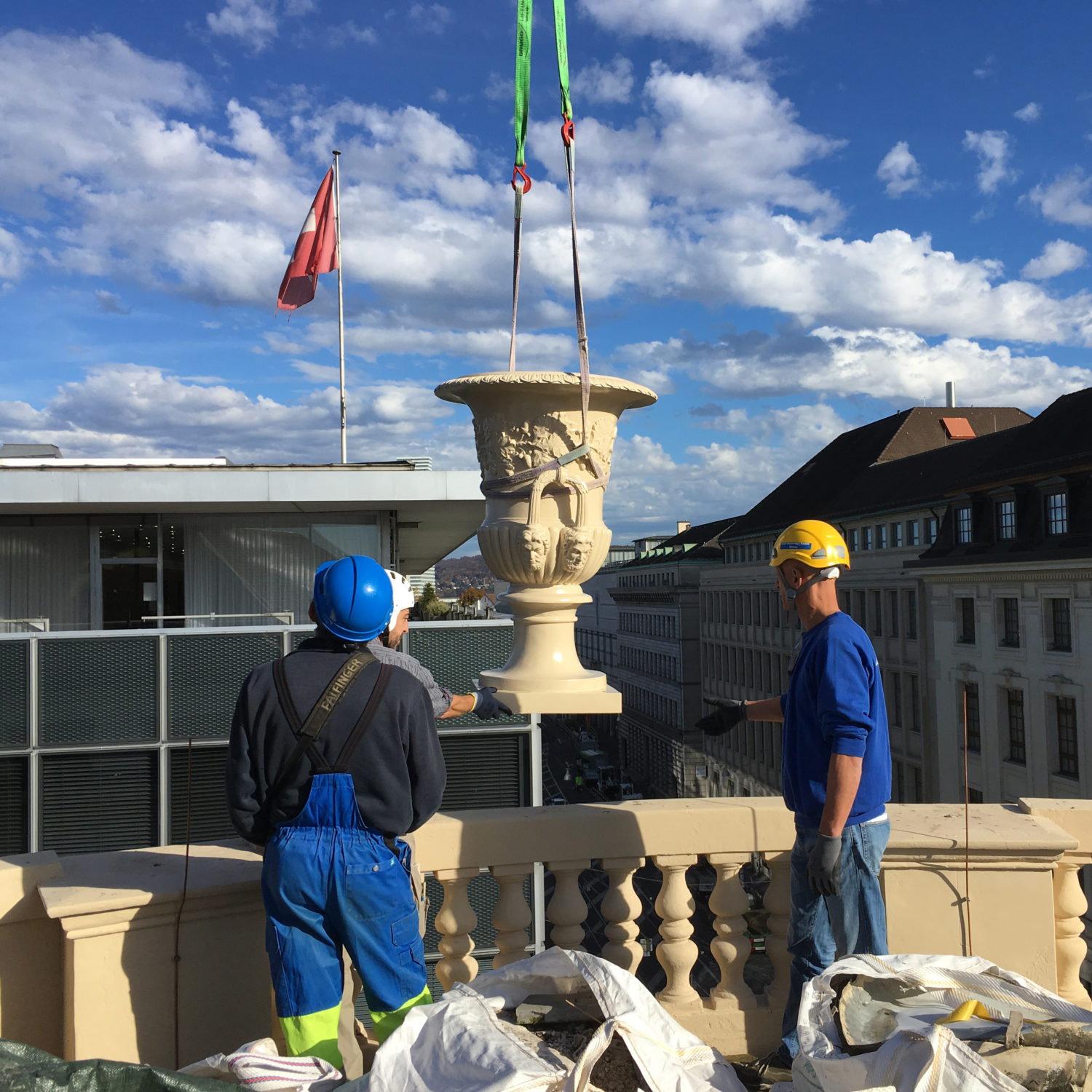 Gemeinsam mit den Fachspezialisten und der kantonalen Denkmalpflege wurde für den Schilthof ein sanftes Sanierungskonzept für die Fassadensanierung entwickelt. Die Fassade wurde mit einem speziellen Niederdruckverfahren gereinigt und mit einem farblich identischen mineralischen Farbanstrich erneuert. Starke Zerstörungen im Sandstein, speziell im Sockelbereich und an den Balustraden, wurden komplett saniert, erneuert oder ersetzt. Die völlig zersetzten Vasen auf dem Rondell wurden gesichert und rückgebaut. Von einer der gesicherten Vasen wurde ein Abdruck genommen, von der sechs Ersatzvasen in Aluminium gegossen wurden. Holz- und Metallwerke wurden gereinigt, partiell ausgebessert und durch entsprechende Oberflächenbehandlungen aufgefrischt und geschützt. Ferner wurde der aussenliegende Sonnenschutz durch farblich harmonierende Stoffrollos erneuert und automatisiert.