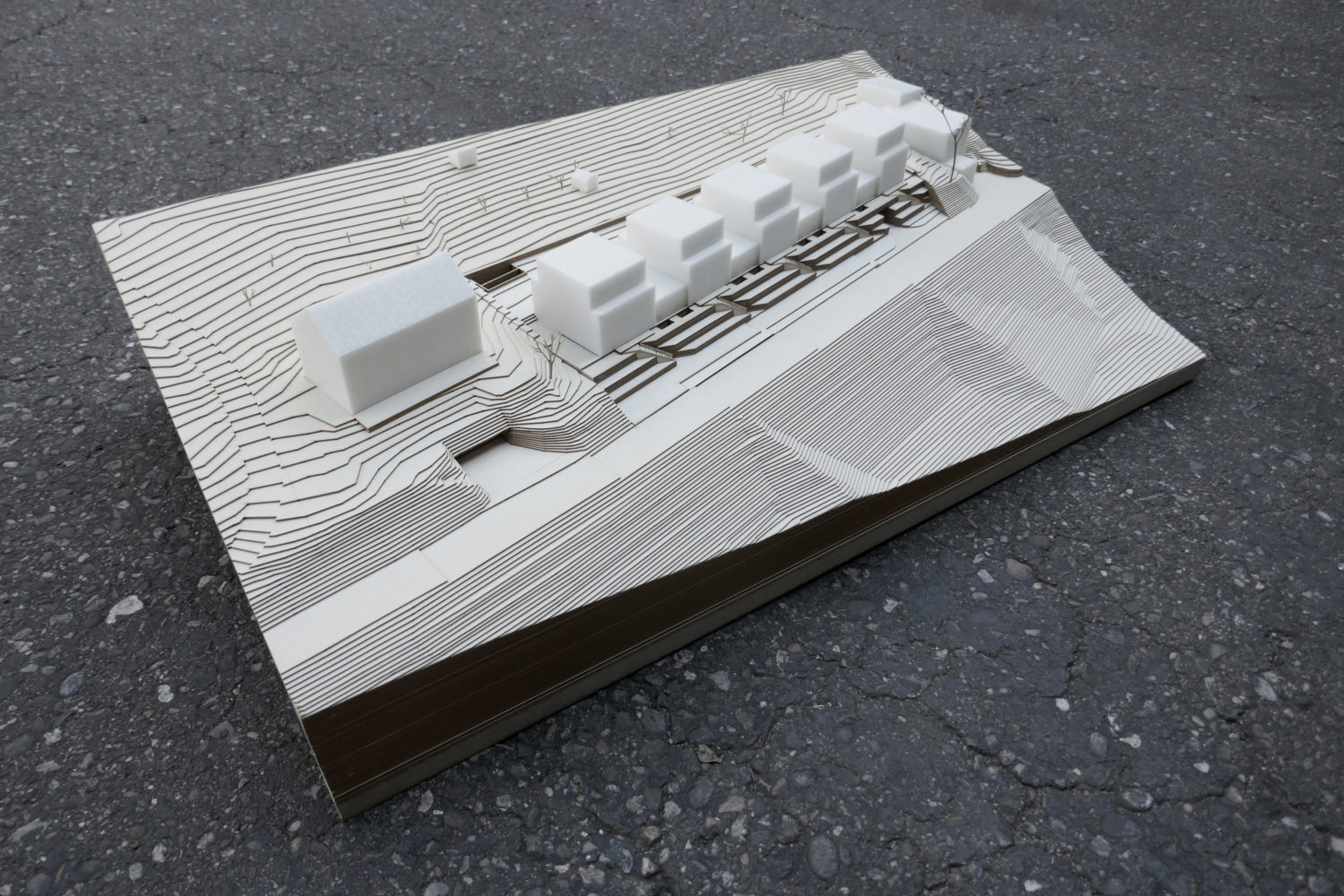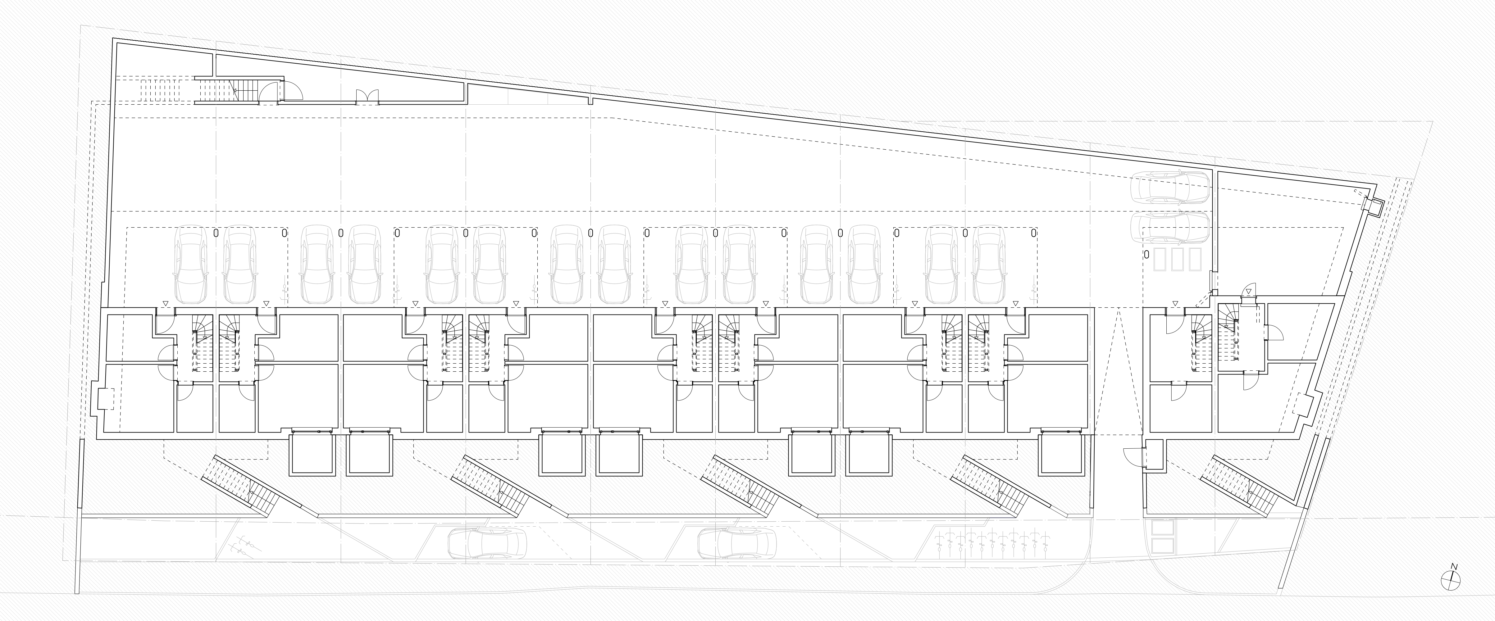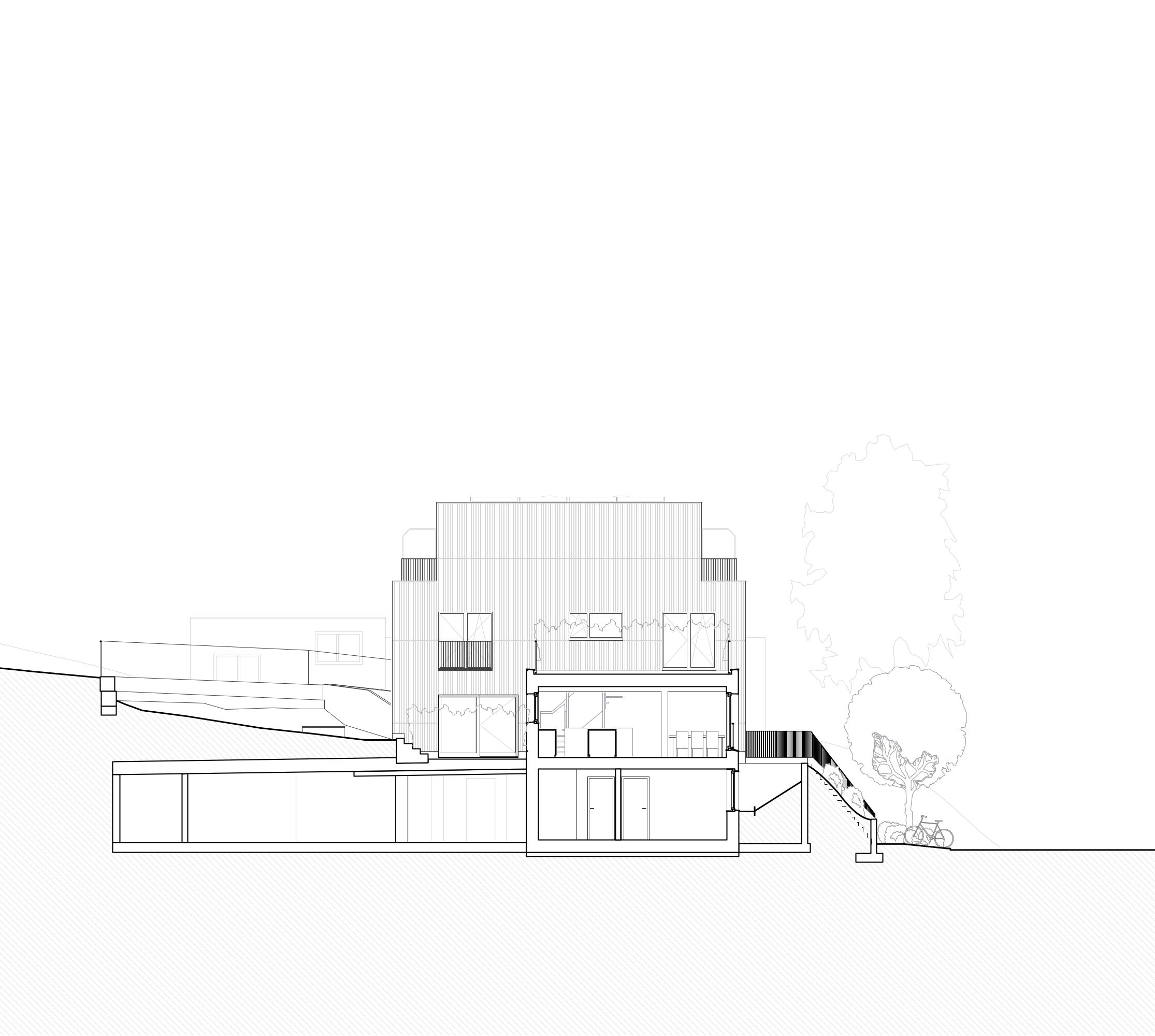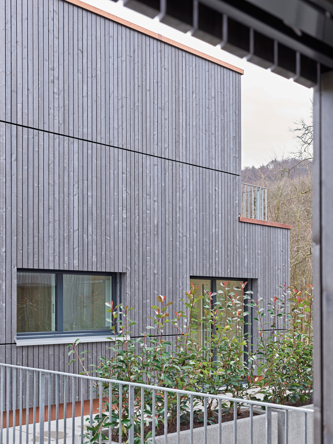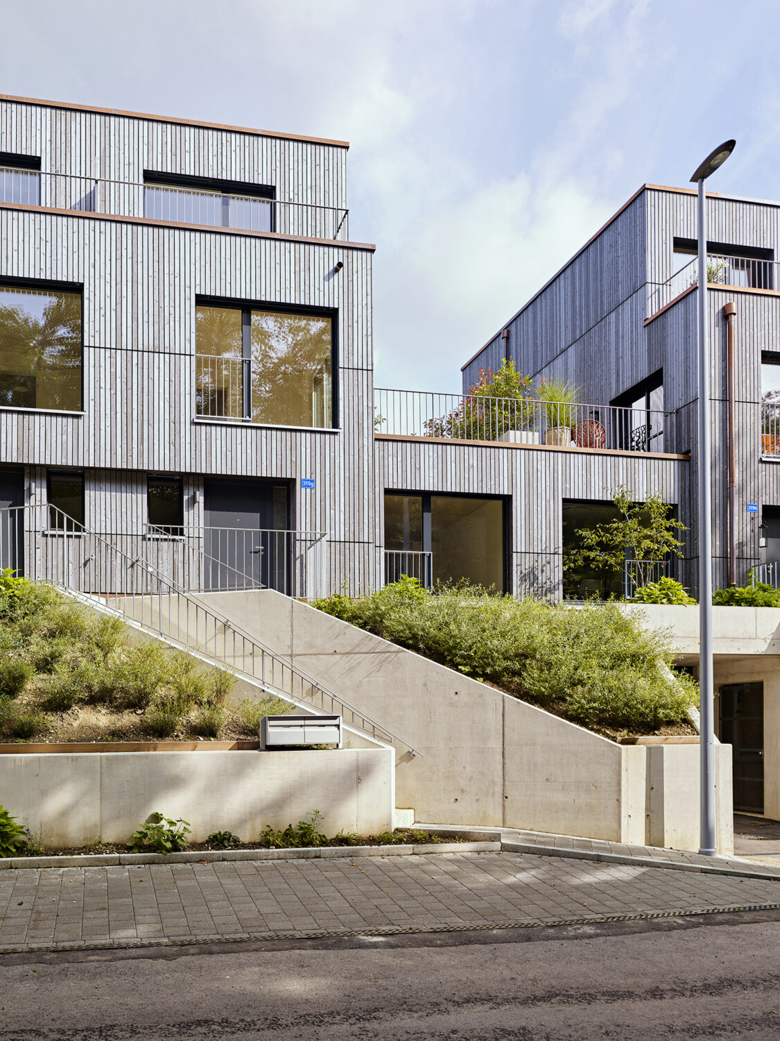 Am Ortsausgang von Riehen in Richtung Inzlingen wurden fünf kompakte Doppel-Einfamilienhäuser mit einer zentralen Einstellhalle realisiert. Die Erschliessung der zehn Häuser erfolgt über gemeinsame Treppenanlagen, die sich durch begrünte Vorgärten ziehen. Über eine gemeinsame Eingangszone gelangt man über den Entréebereich in den grosszügigen Wohn- und Essbereich, der sich von Norden nach Süden durch das Gebäude steckt. Durch den eingeschnittenen Sitzplatz werden die Räume über jeweils drei Himmelsrichtungen Norden, Süden und Osten resp. Westen belichtet. Im Obergeschoss befinden sich zwei Schlafzimmer sowie das dazugehörige Badezimmer. Das Elternschlafen, ein Badezimmer mit Ankleide resp. Arbeiten bilden zusammen das Attikageschoss. Die kompakte Erschliessung belohnt durch grosszügig wirkende Räume und Ausblicke. Alle Schlafräume werden zweiseitig über Eck belichtet und binden den Naturraum ein.