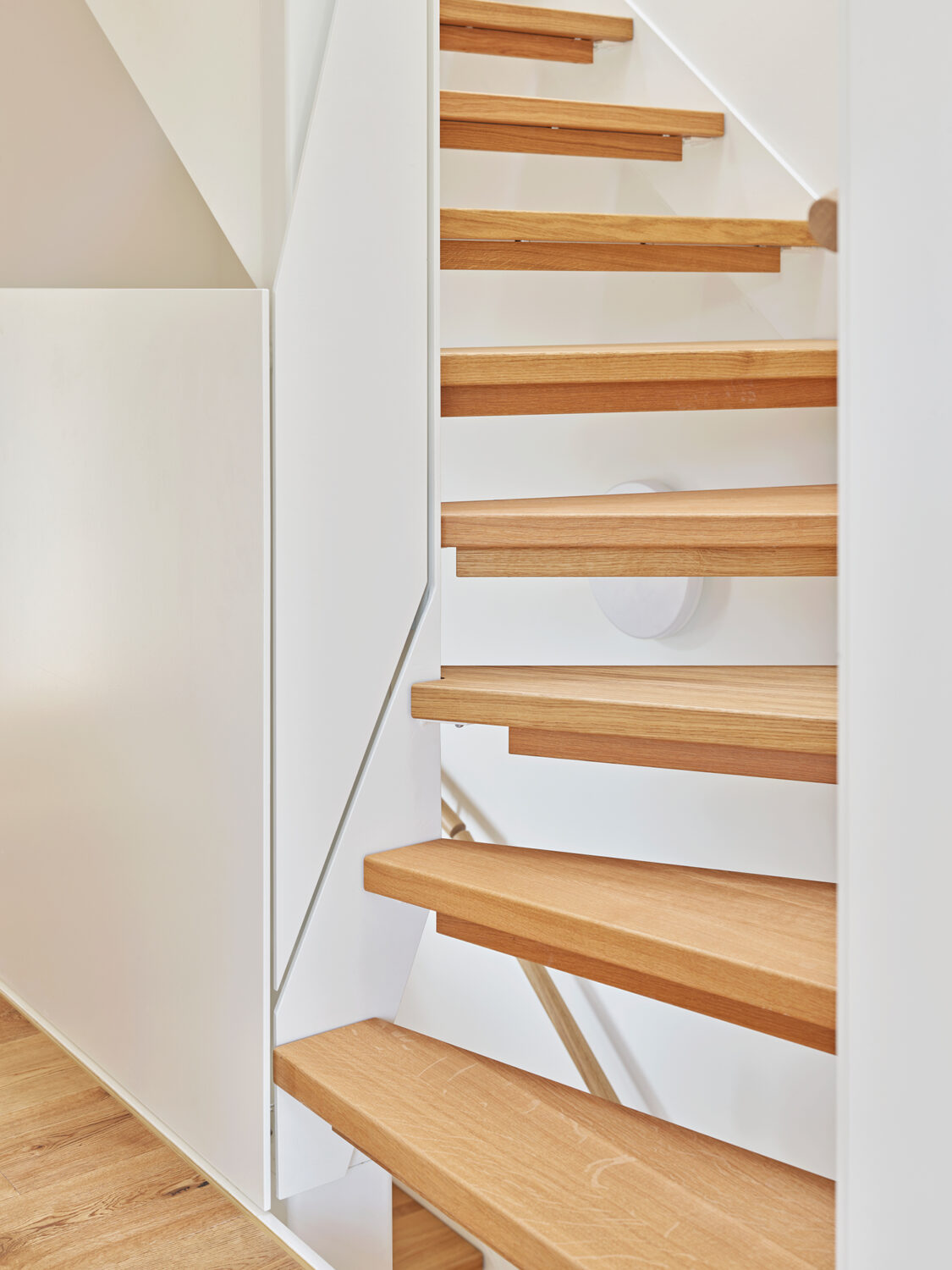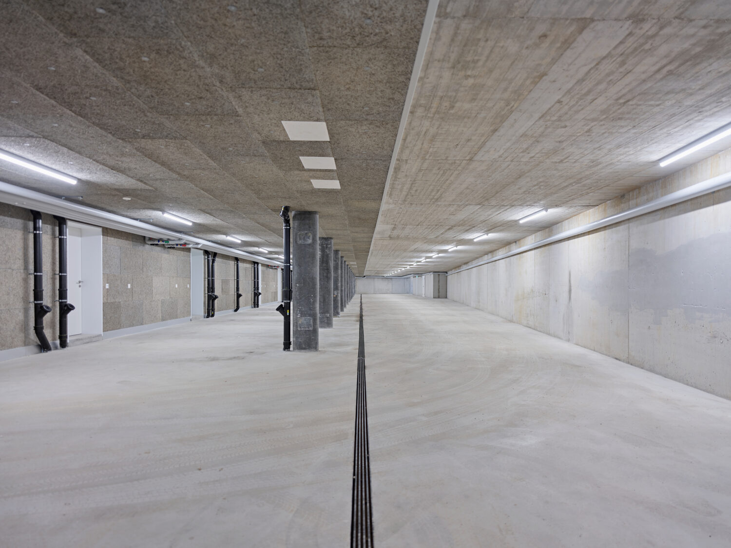 Die Häuser sind ab Oberkante Erdgeschoss in moderner vorgefertigten Holzelementbauweise konstruiert und erhielten eine vorvergraute, hinterlüftete Holzlamellenfassade. Acht Erdsonden mit einer Tiefe von je 180 Metern kombiniert mit einer Wärmepumpe sorgen für den notwendigen Wärmebedarf im Winter – Im Sommer kann die Fussbodenheizung zum Kühlen herangezogen werden. Den notwendigen Strom für die Wärmepumpe liefert die Photovoltaikanlage auf den Flachdächern der Häuser. Autos und Velos sind in der ebenerdigen Einstelle untergebracht von der man das jeweilige Haus separat erschliesst.